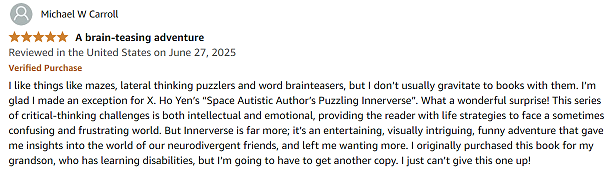 “Two words, fun and insightful. I found the book not only entertains, but also educates as it sheds a much needed light on the unique way autistic minds perceive the world. I believe it would be perfect for families, or even classrooms, to explore together. By conquering each puzzle as a team, it enhances connections and builds a stronger support system through understanding and empathy.”